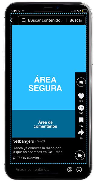 En TikTok, la zona segura es muy parecida a las dos plataformas anteriores. Sin embargo, tené en cuenta que los comentarios aparecen desde abajo hacia arriba en la parte inferior de la pantalla, lo que deja un pequeño espacio sin superposición de datos en tu video. Los iconos de interacción se extienden casi hasta la mitad de la pantalla.